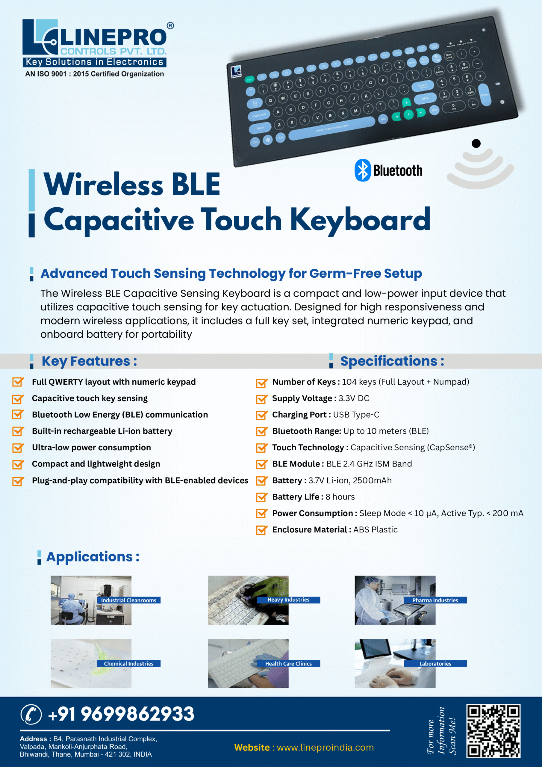 Linepro Wireless Touch Keyboard | Spill Resistant | Flat & Glossy Surface | For PC Laptop | Backlight Illumination